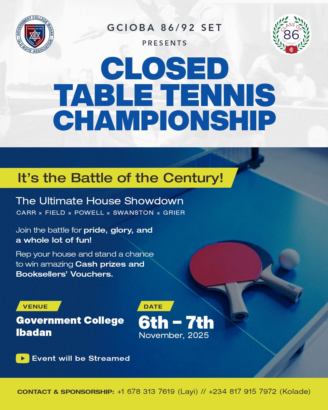 The organisers of the Government College Ibadan Old Boys Association 86/92 set Closed Table Tennis Championship have announced a new date for the tournament after the government announcement of midterm break for the students of the school during the initial date of October 30 and 31.